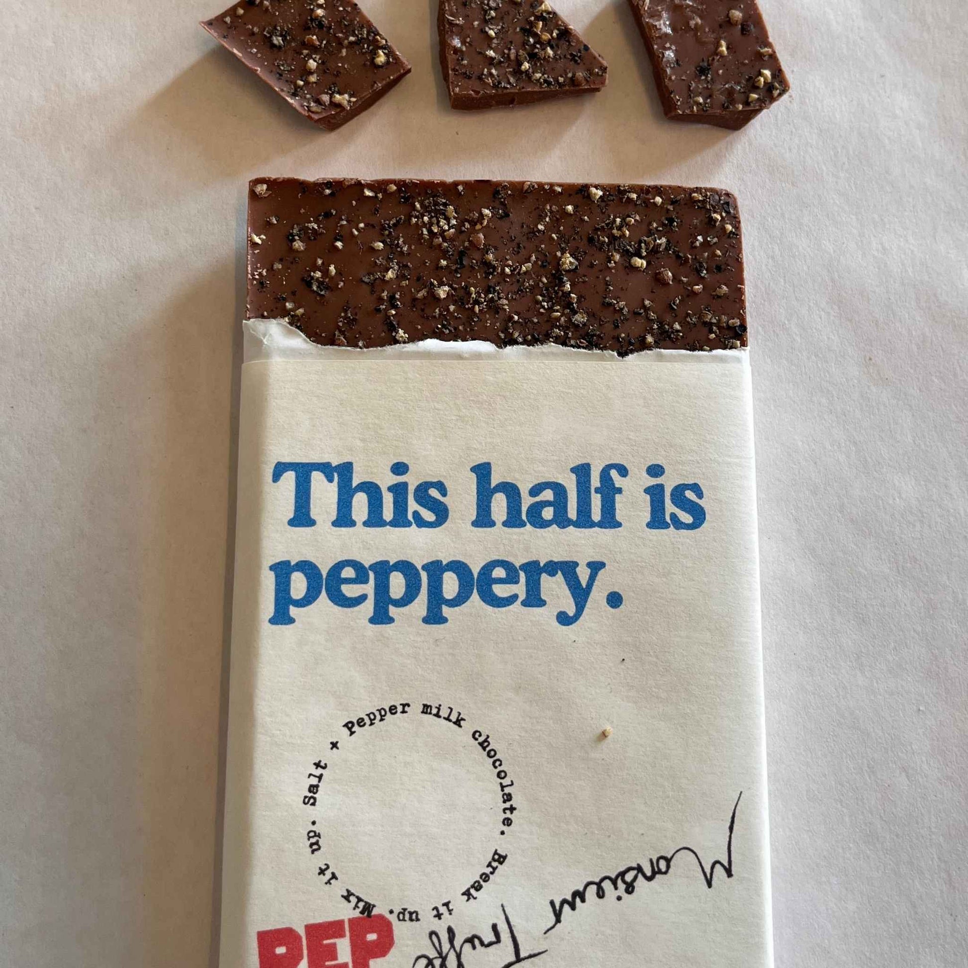 Half this bar of milk chocolate has sea salt on it. The other half is covered in single origin black pepper. Break it up. Mix it up. Enjoy it however you like.
