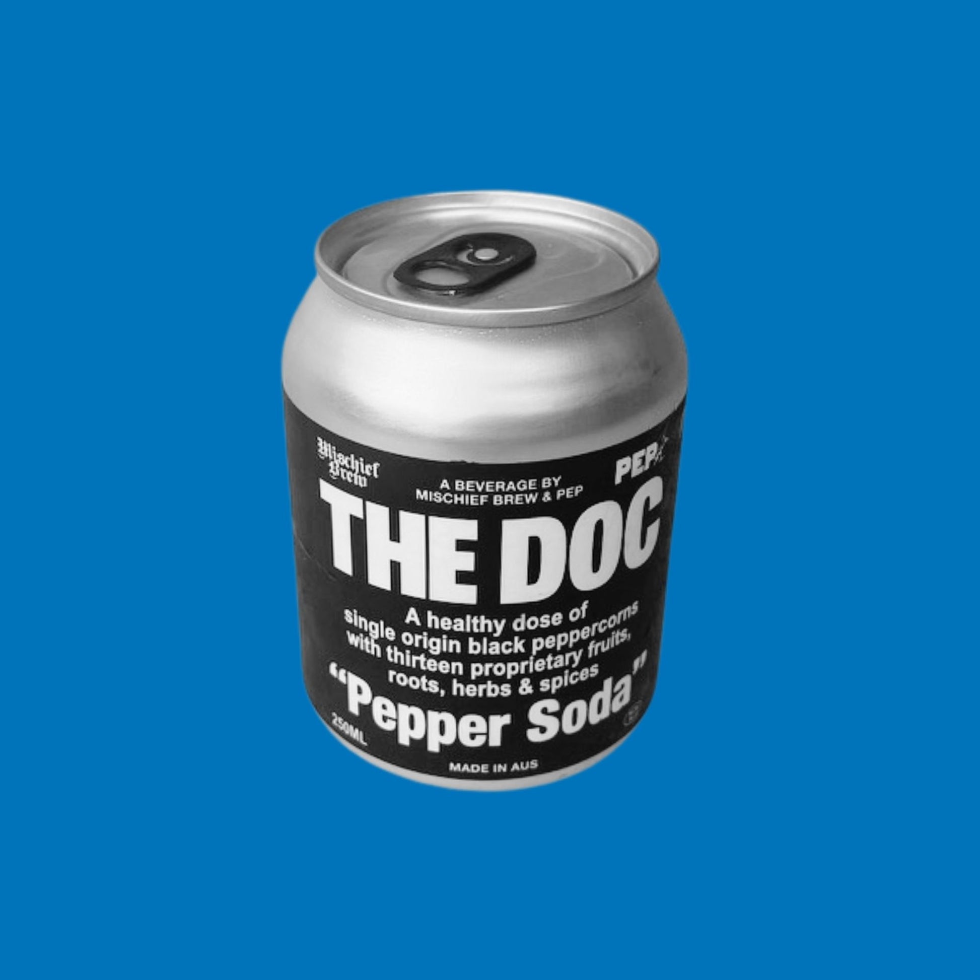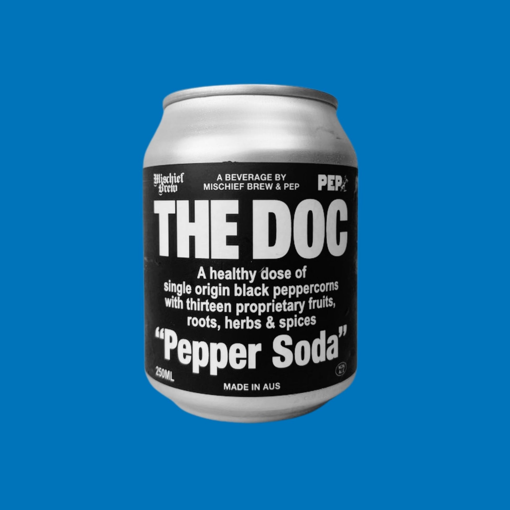 A classic Pepper Soda reimagined by Mischief Brew featuring premium single-origin black pepper from Pep, The Doc delivers big on citrus, spice and a dark cherry hit.